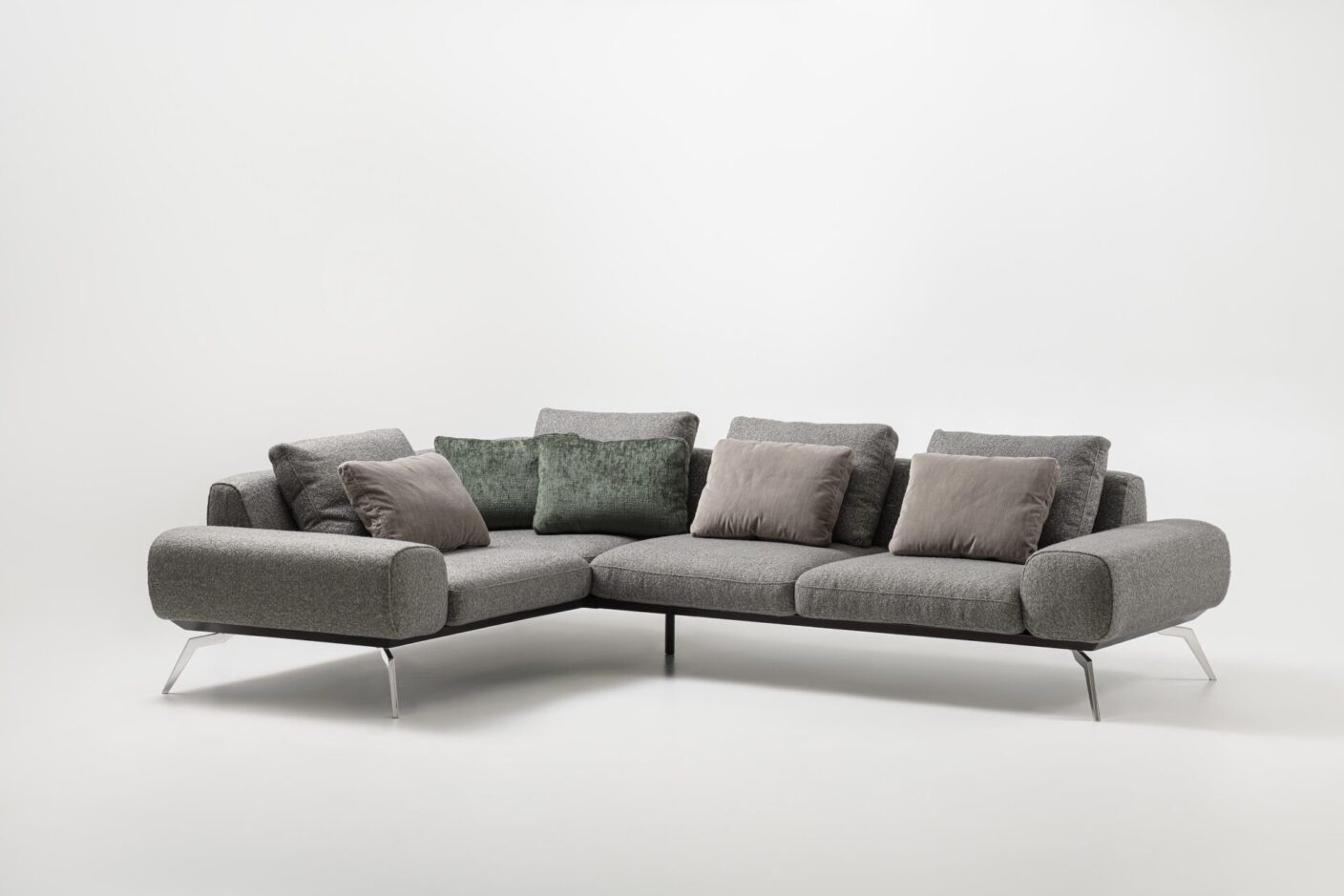- В наполнении подушек современного дизайнерского углового дивана используется искусственный лебяжий пух, который придает глубину посадки, упругость и мягкость. Этот материал идеально подстраивается под контуры тела, создавая ощущения невесомости и легкости. Искусственный пух в наполнении подушек дивана премиум класса обладает отличными терморегуляционными свойствами, что делает его использование комфортным в любое время года.
